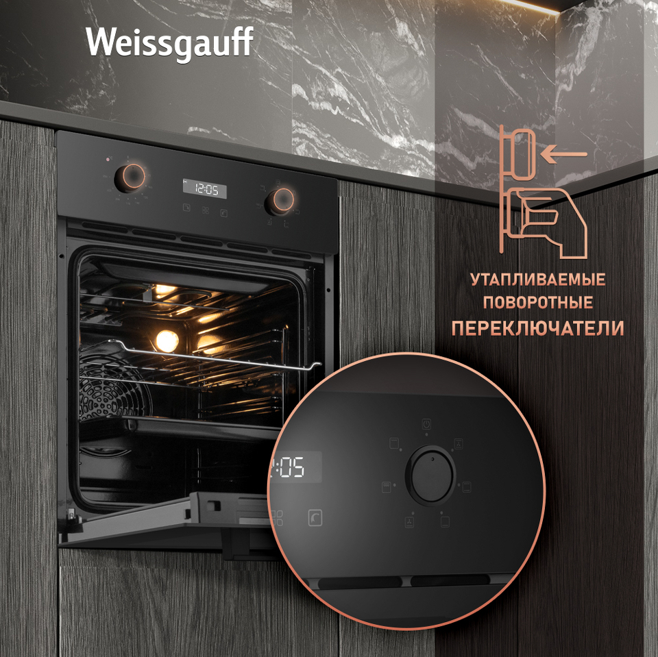 Компактный электрический духовой шкаф от Weissgauff шириной всего 45 см, выполненный в чёрном цвете, оснащён чувствительным сенсорным управлением, утапливаемыми рукоятками PIPO и 6 режимами, сочетая в себе одновременно удобство и функциональность!