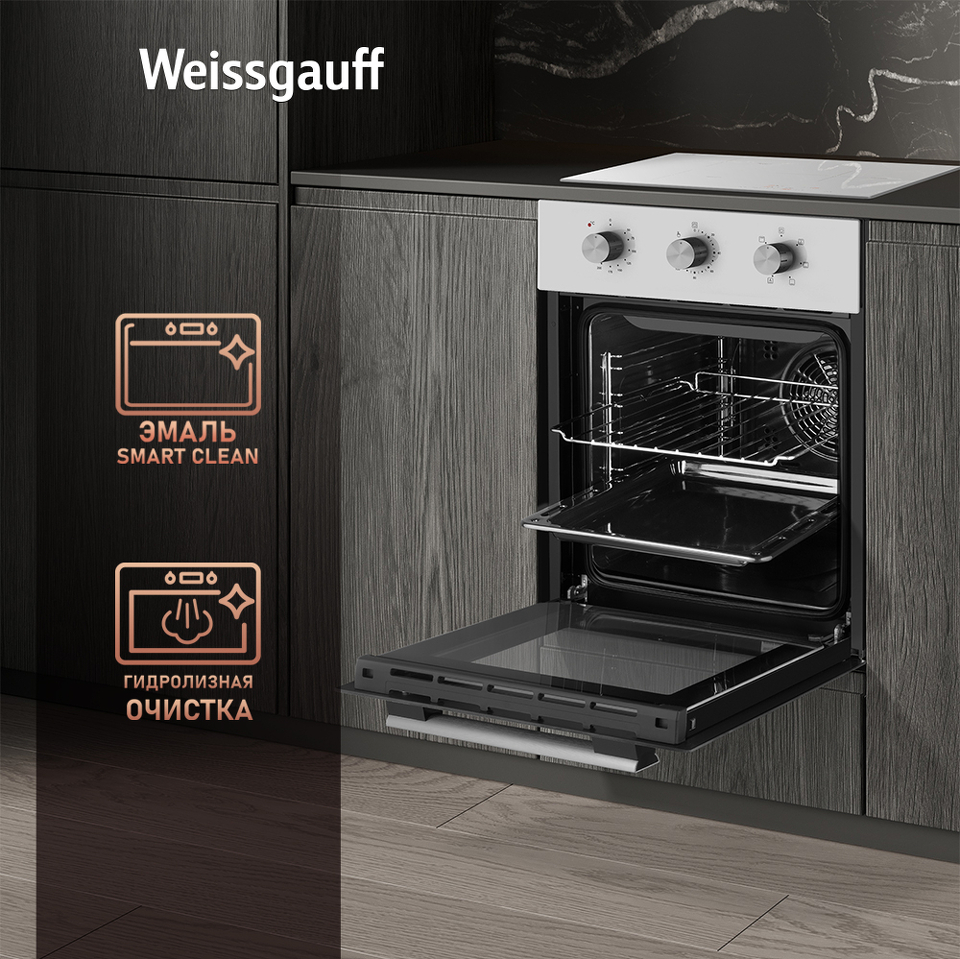 • Гидролизная очистка - особая технология, благодаря который вы раз и навсегда забудете те дни, когда духовой шкаф необходимо было с большим трудом вычищать, вкладывая в это непозволительно много времени и сил. Weissgauff понимает, что в современном мире время является одной из наивысших ценностей - поэтому мы оснастили данную модель функцией гидролиза: всего лишь добавьте небольшое количество воды, и духовой шкаф сам отпарит все загрязнения, используя "эффект сауны", после чего вам останется лишь провести по стенкам мягкой губкой, собрав их и удалив одним движением.