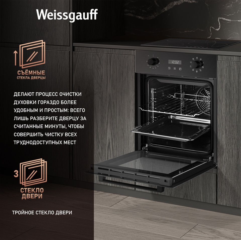 Тройное стекло дверцы, воплощающее в себе весь подход к безопасности и термозащите, который Weissgauff реализовали в данной модели. Такое стекло обеспечивает вам значительно большую степень защиты при случайных прикосновениях к нагревающейся дверце плиты, чем в моделях, не оснащенных технологией многослойного стекла. Для нас в Weissgauff важно, чтобы работа с бытовой техникой была не только приятной, но и безопасной!