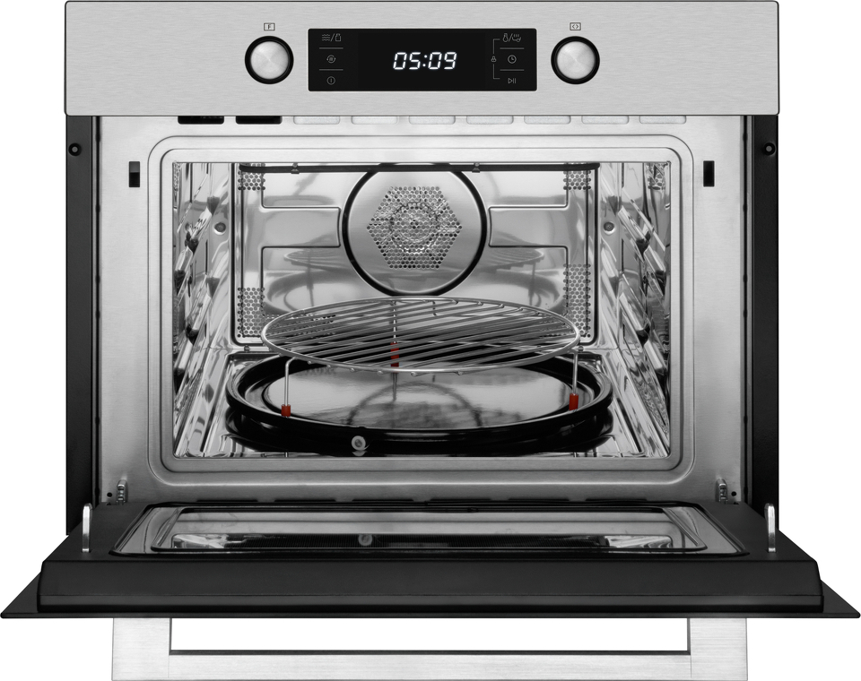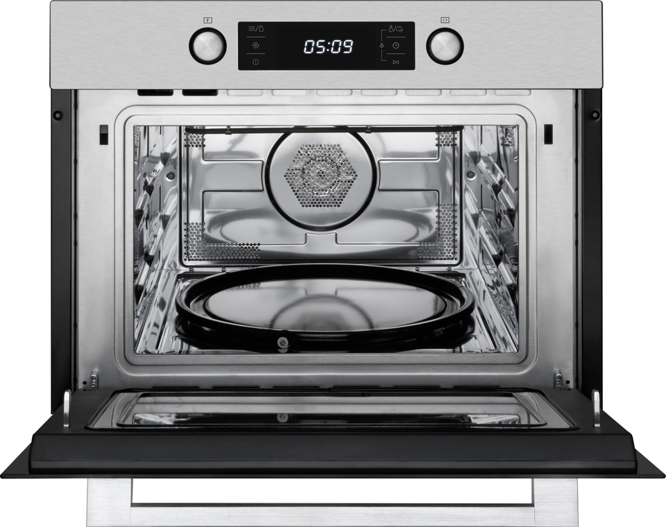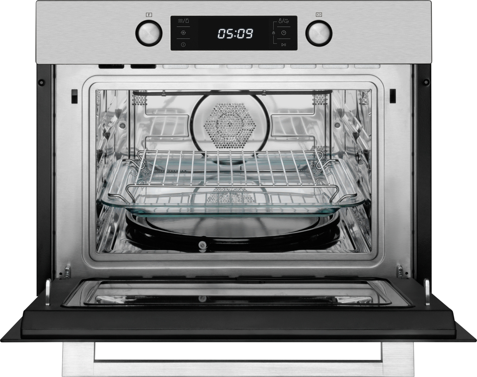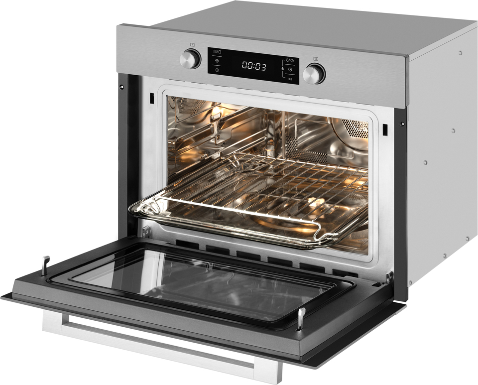 Встраиваемый компактный духовой шкаф с микроволнами , который сочетает в себе сразу два полноценных устройства: духовой шкаф с конвекцией и грилем, а также микроволновую печь с отдельными набором настроек и возможностью использования комбинированного режима.