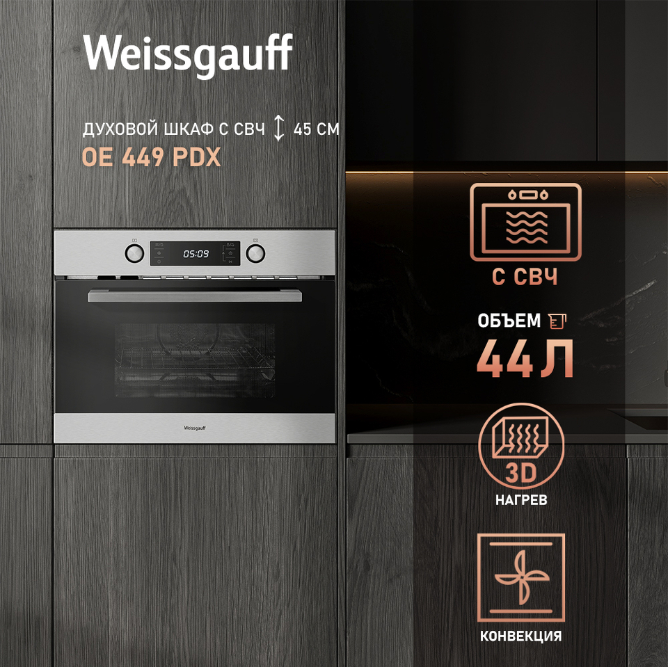 Компактный духовой шкаф с функцией СВЧ от Weissgauff, выполненный в цвете "нержавеющая сталь" - это функционал сразу двух полноценных устройств, воплощённый в одной модели, оснащенной тройным стеклом в дверце и расширенной комплектацией!
