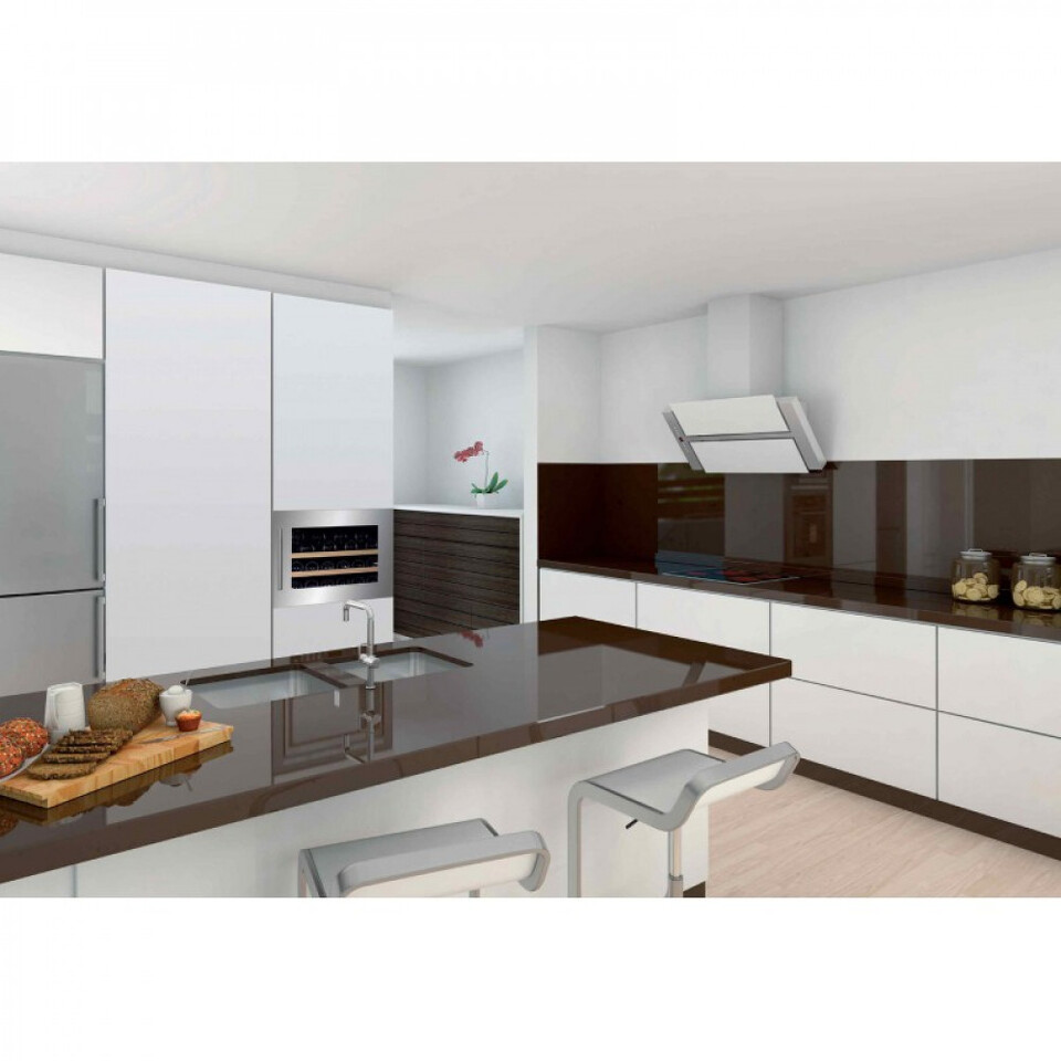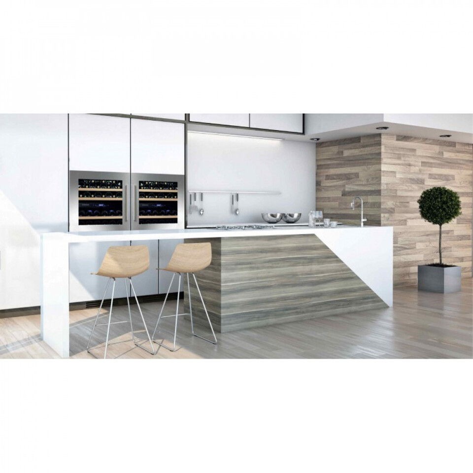 Модель DAB-28.65SS на базе малошумного компрессора имеет 1 зону охлаждения, вмещает в себя до 28 бутылок вина и создает оптимальные условия для хранения вина и подготовке к дегустации. Шкаф оснащен внутренним вентилятором для равномерного доступа холодного воздуха ко всем полкам шкафа. Комплектуется холодильник DAB-28.65SS тремя выдвижными деревянными полками, выполненными из древесины бука.Шкаф оснащен сенсорной панелью управления, с помощью которой пользователь выбирает необходимый температурный режим работы аппарата. В модель встроена функция звукового оповещения об открытой двери, для включения которой необходимо прикоснуться к кнопке питания, а отключается она в случае, когда дверь открыта более 60 секунд.В холодильнике Dunavox DAB-28.65SS встроена функция "Отдых", которая позволяет отключить дисплей, подсветку и звуковые оповещения, но при этом винный шкаф продолжит охлаждать вино. Такой режим действует 96 часов, по истечении которых автоматически отключается.В винном холодильнике Dunavox DAB-28.65SS предусмотрена возможность перевешивания двери на другую сторону, что дает дополнительное удобство при установке холодильника в подходящее по габаритам место.Корпус модели металлический с покрытием черного цвета, дверца выполнена из прозрачного двойного стеклопакета, защищенного от воздействия ультрафиолетовых лучей в рамке из полированной нержавющей стали. Ручка двери удобная, накладная, выполнена из нержавеющей стали. Цифровой индикатор температуры и внутреннее освещение на светодиодах синего цвета.Винный шкаф Dunavox DAB-28.65SS предназначен для встраивания в нишу. Для обеспечения отвода горячего воздуха необходимо предусмотреть сквозную вентиляционную нишу площадью не менее 200 см² от цоколя до верхней части мебельного модуля (см. рисунок).Рекомендуется устанавливать винный шкаф Dunavox DAB-28.65SS вдали от прямых солнечных лучей и источников тепла (духовки, нагревателя, батареи и т.д.). Прямой солнечный свет может плохо повлиять на корпус, а источники тепла могут увеличить энергопотребление. Не допускается установка аппарата рядом с плитой или прибором, который может нагревать воздух в пространстве 1-5 см от его корпуса (например, рядом схолодильником, у которого теплообменная стенка граничит с аппаратом). Не рекомендуется устанавливать прибор на полы с подогревом без специальной термоизолирующей подложки.Отличительные особенностиОдна зона охлажденияАвтоматическая система разморозки.Три деревянные полки без лакового покрытия.Компрессор с минимальным уровнем шума 39 дБ.Увеличенная до 3 лет гарантия. Функциональные особенностиДверца шкафа выполнена из двойного стеклопакета с защитой от УФ лучей в рамке из нержавеющей стали.Регулируемый температурный режим в диапазоне от +5°C до +22° позволяет хранить белые, красные и игристые вина.Внутренний вентилятор способствует равномерному распределению температуры по всему объему шкафа.Функция звукового оповещения об открытой двери.Функция "Отдых".Дверь перевешивается.Удобная сенсорная панель управления обеспечивает простую и быструю установку необходимой температуры.Светодиодная подсветка.
