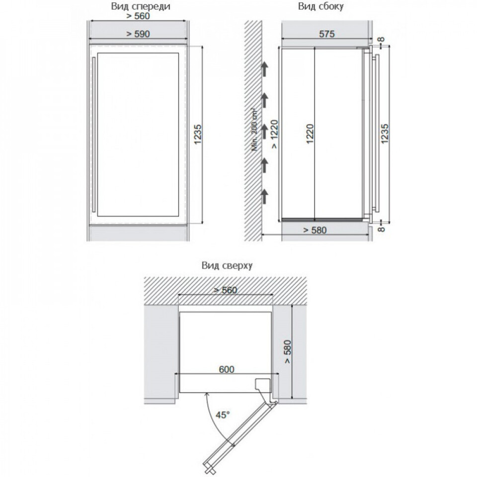 Винный шкаф Dunavox DAB-89.215DSS предназначен для встраивания в нишу. Для обеспечения охлаждения компрессора и отвода горячего воздуха необходимо предусмотреть сквозную вентиляционную нишу площадью не менее 200 см² от цоколя до верхней части мебельного модуля (см. рисунок).
