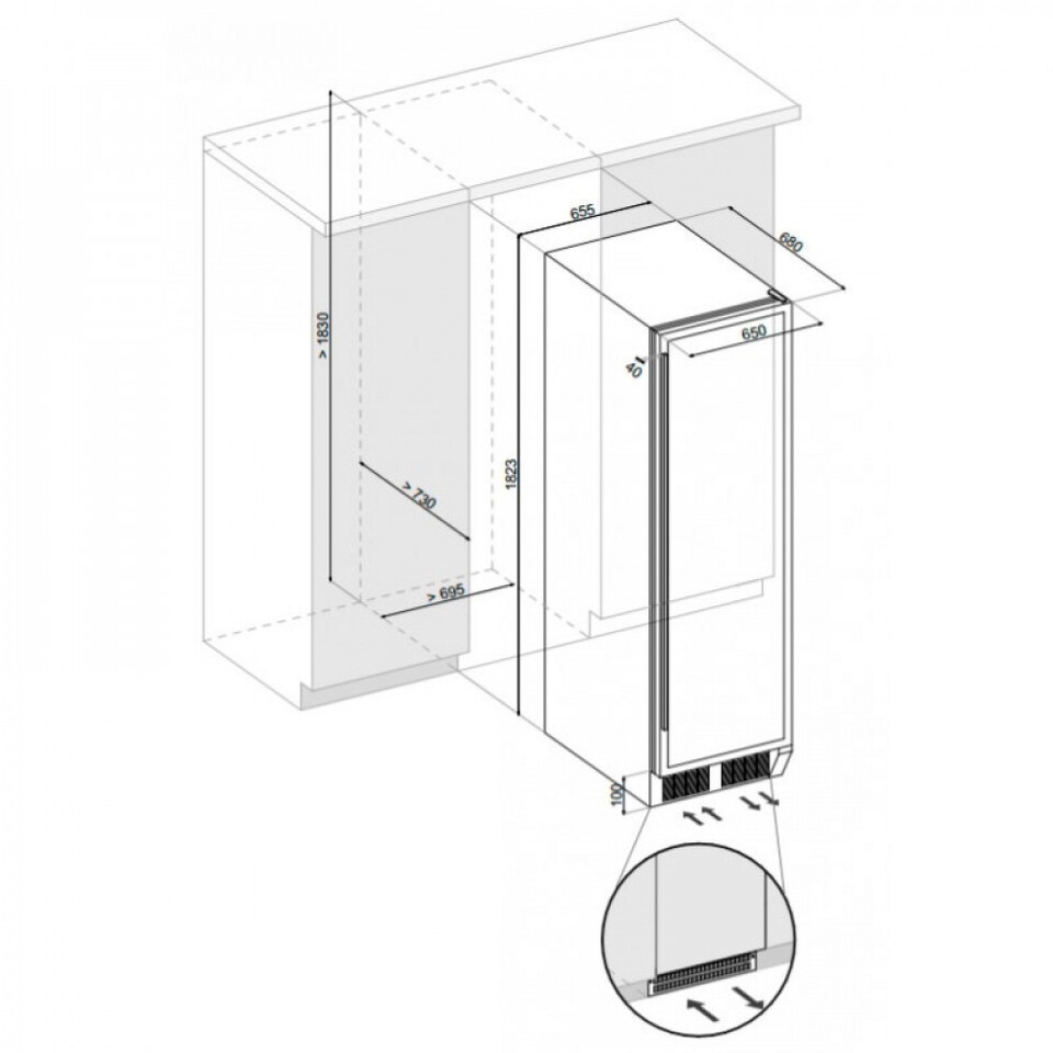 Компрессорный винный шкаф DX-170.490STSK может быть встроен в мебельную встроен в нишу без соблюдения зазоров или использоваться как отдельностоящий. Охлаждение системы компрессора организовано через вентиляционные решетки внизу шкафа.