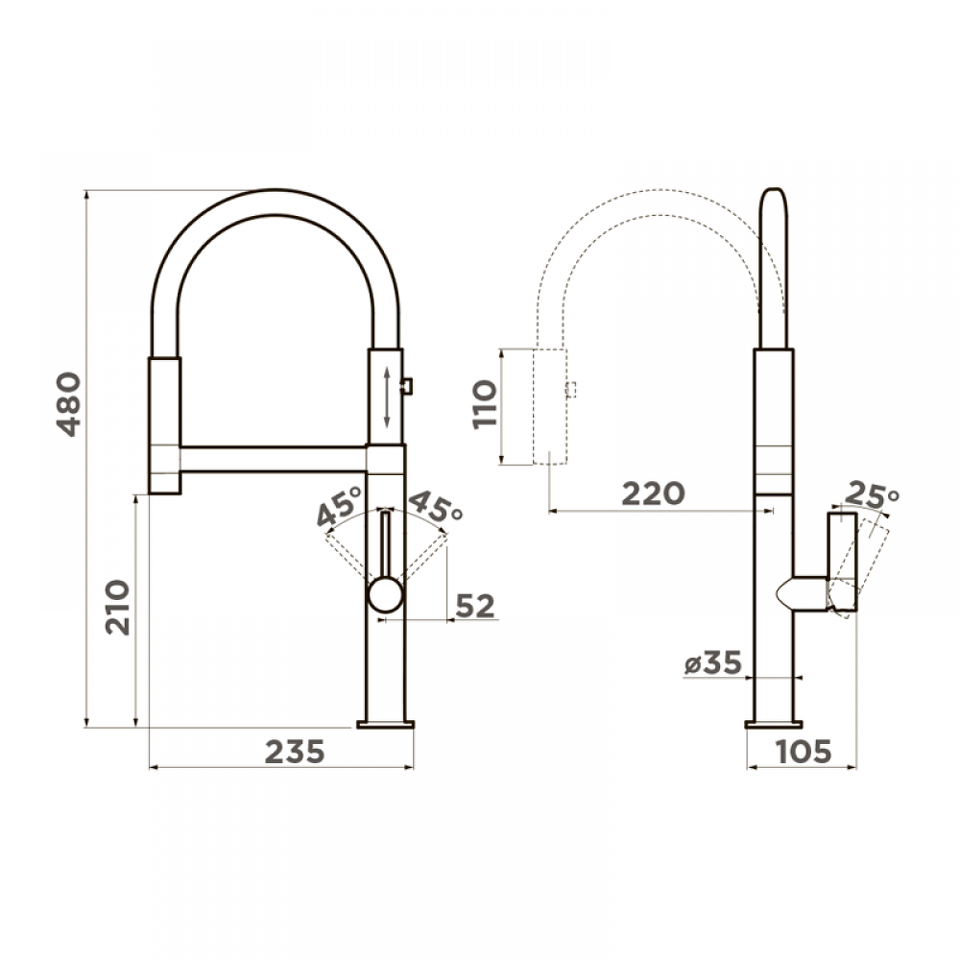 • Длина высокого поворотного излива увеличивается по желанию за счёт шланга на магните.