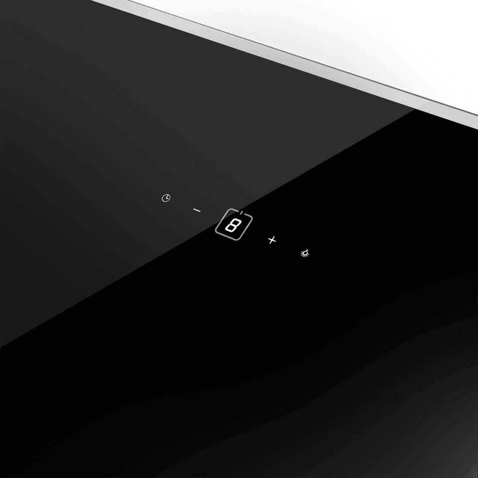 Элегантная наклонная вытяжка шириной 90 см для небольшой кухни. Фасад выполнен полностью из глянцевого закаленного стекла. Сенсорное управление для выбора режима работы и установки таймера.