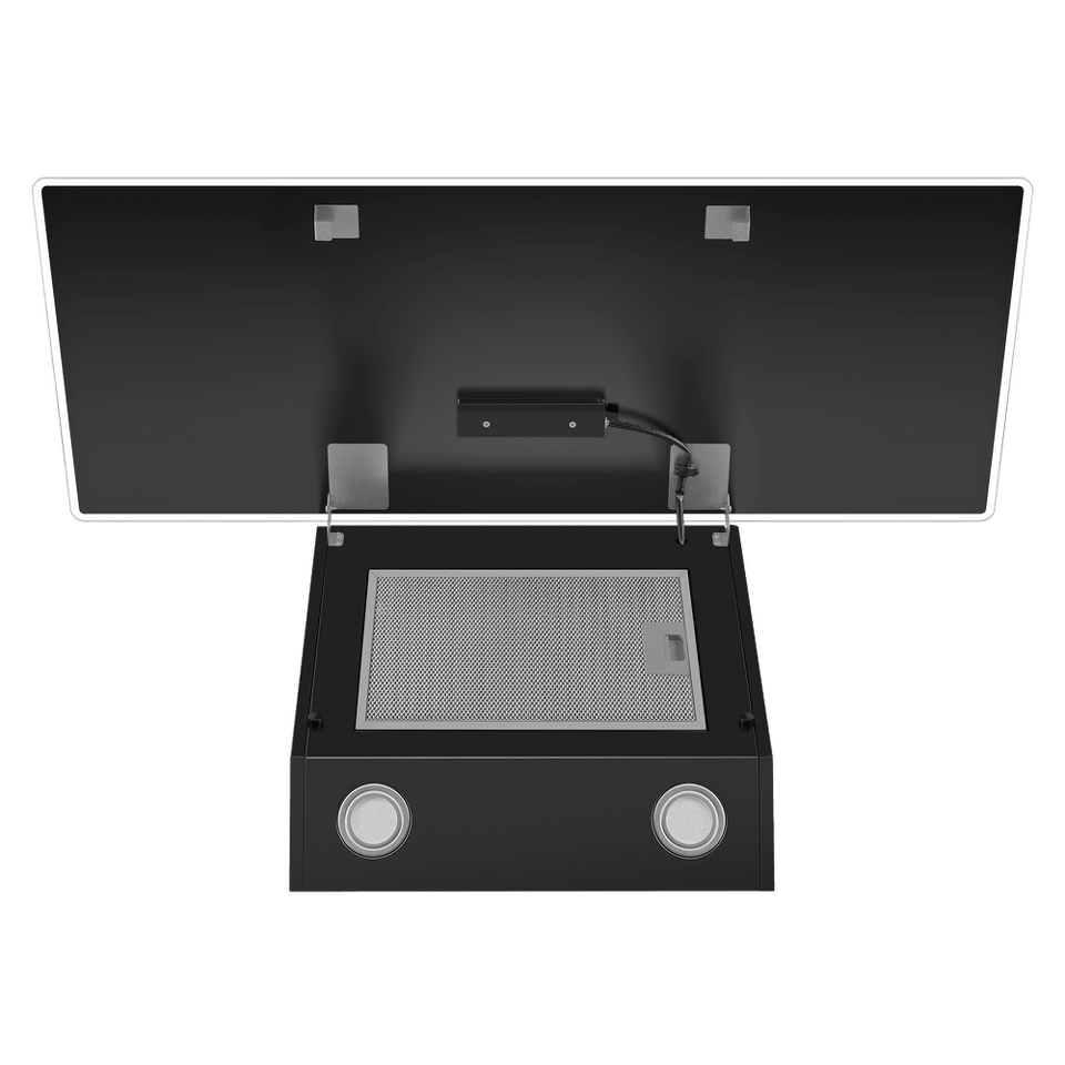 Корпус вытяжки выполнен из металла и стекла, что придает ей современный и стильный вид. Окантовка и панель изготовлены из стекла, что добавляет изысканности и элегантности.