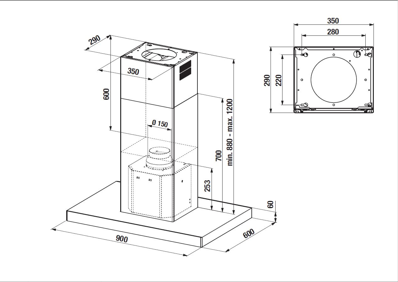 Скорость вытяжки: макс. нормальная мощность 580 м3/ч, интенсивный режим мощности 700 м3/ч