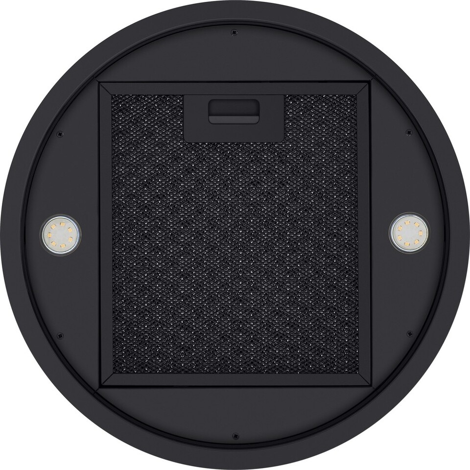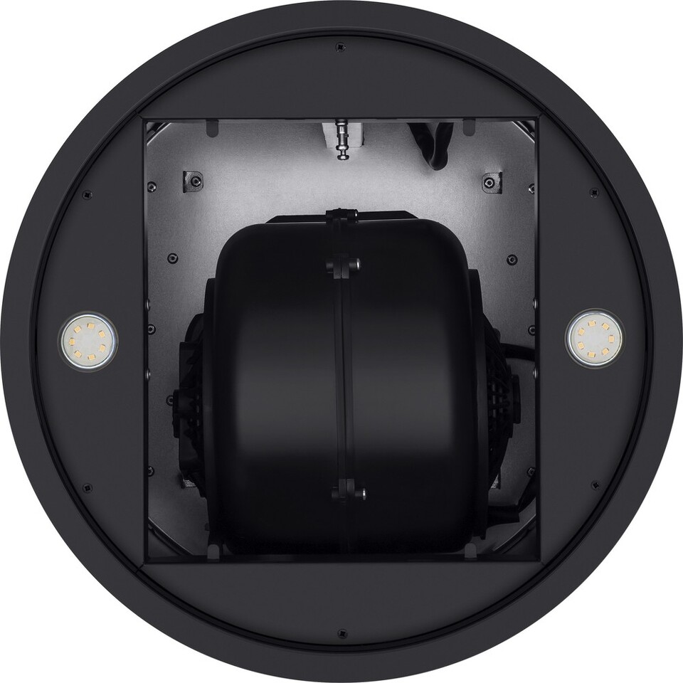 Корпус цилиндрической  формы, выполненный из нержавеющей стали с термостойким покрытием черного цвета, монтируется на потолок над варочной поверхностью. В нижнем торце вытяжки расположен специальный многослойный жироулавливающий фильтр, который легко вынимается и полностью разбирается для чистки.