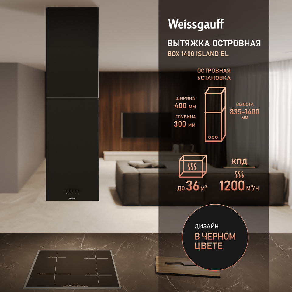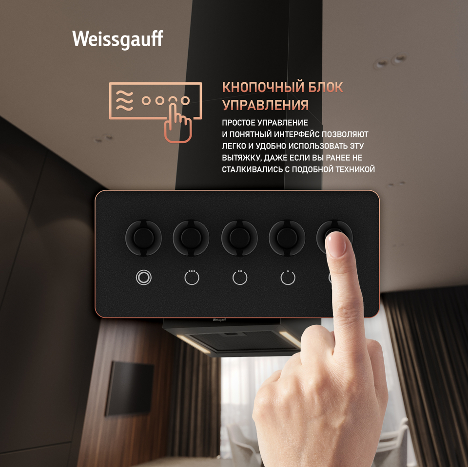 Островная вытяжка от Weissgauff с креплением на потолочном кронштейне, выполненная в черном цвете, имеет низкий уровень шума и оснащена удобным и чувствительным кнопочным управлением. Её дизайн не только порадует своей эффективностью, но и станет настоящим украшением вашей кухни!