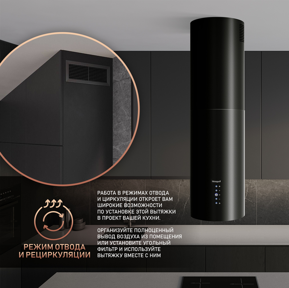 Дизайн, выполненный в черном цвете станет финальным штрихом в совершенстве великолепного облика этой модели. Каждый раз, заходя на кухню, вы будете чувствовать, что эта вытяжка - не просто функциональное устройство, но и настоящее украшение вашей кухни!