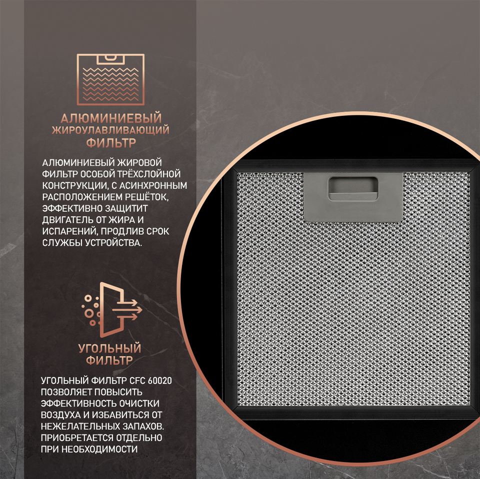 Возможность установки угольного фильтра станет отличным решением для вытяжки, работающей в режиме рециркуляции, позволяющим повысить эффективность очистки воздуха и избавиться от нежелательных запахов!