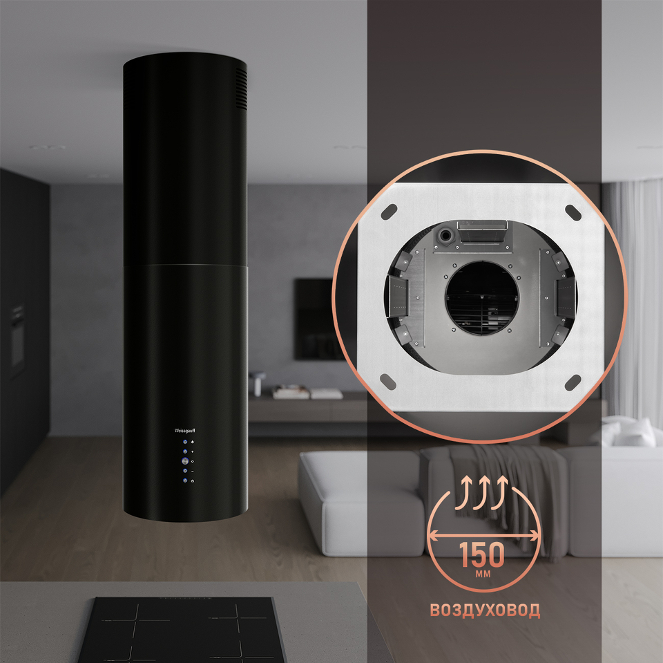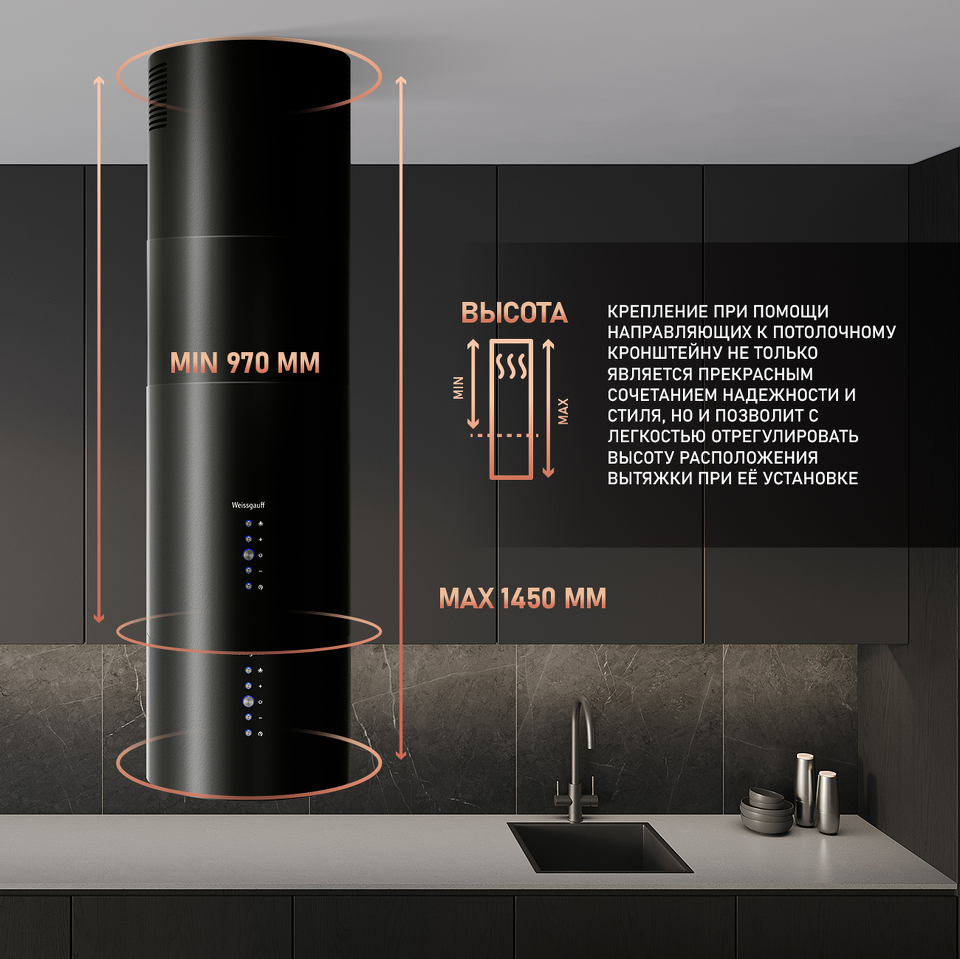 Островная вытяжка от Weissgauff с креплением на потолочном кронштейне, выполненная в черном цвете, имеет низкий уровень шума и оснащена удобным и чувствительным кнопочным управлением. Её дизайн не только порадует своей эффективностью, но и станет настоящим украшением вашей кухни!