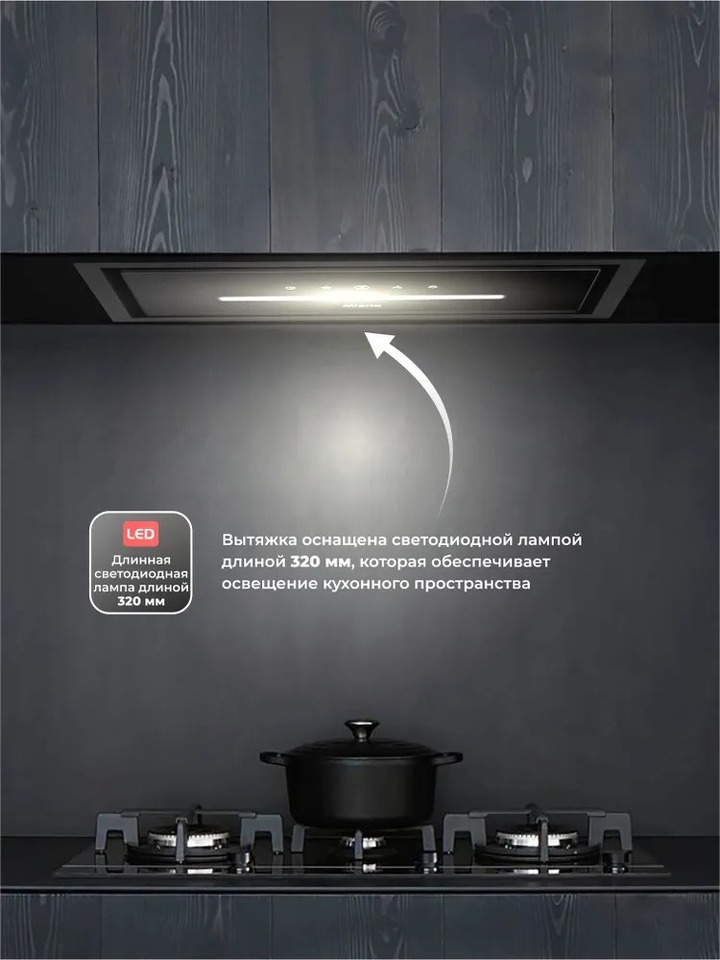- С мощностью 120 Вт она обеспечивает быстрый отвод запахов и жира.