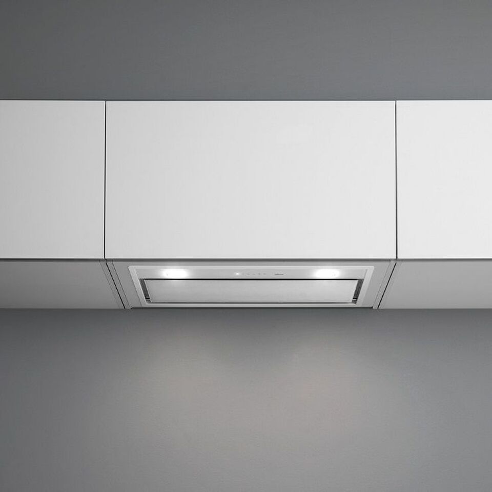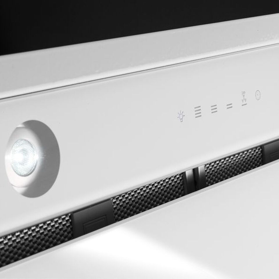 Дизайн. Встраиваемая вытяжка Falmec Design GRUPPO INCASSO MURANO 70 inox vetro bianco (800) производится из нержавеющей стали марки AISI 304. Видимая часть прибора выполнена из закаленного муранского стекла и представлена в белом цвете. На панели расположены элементы сенсорного управления.