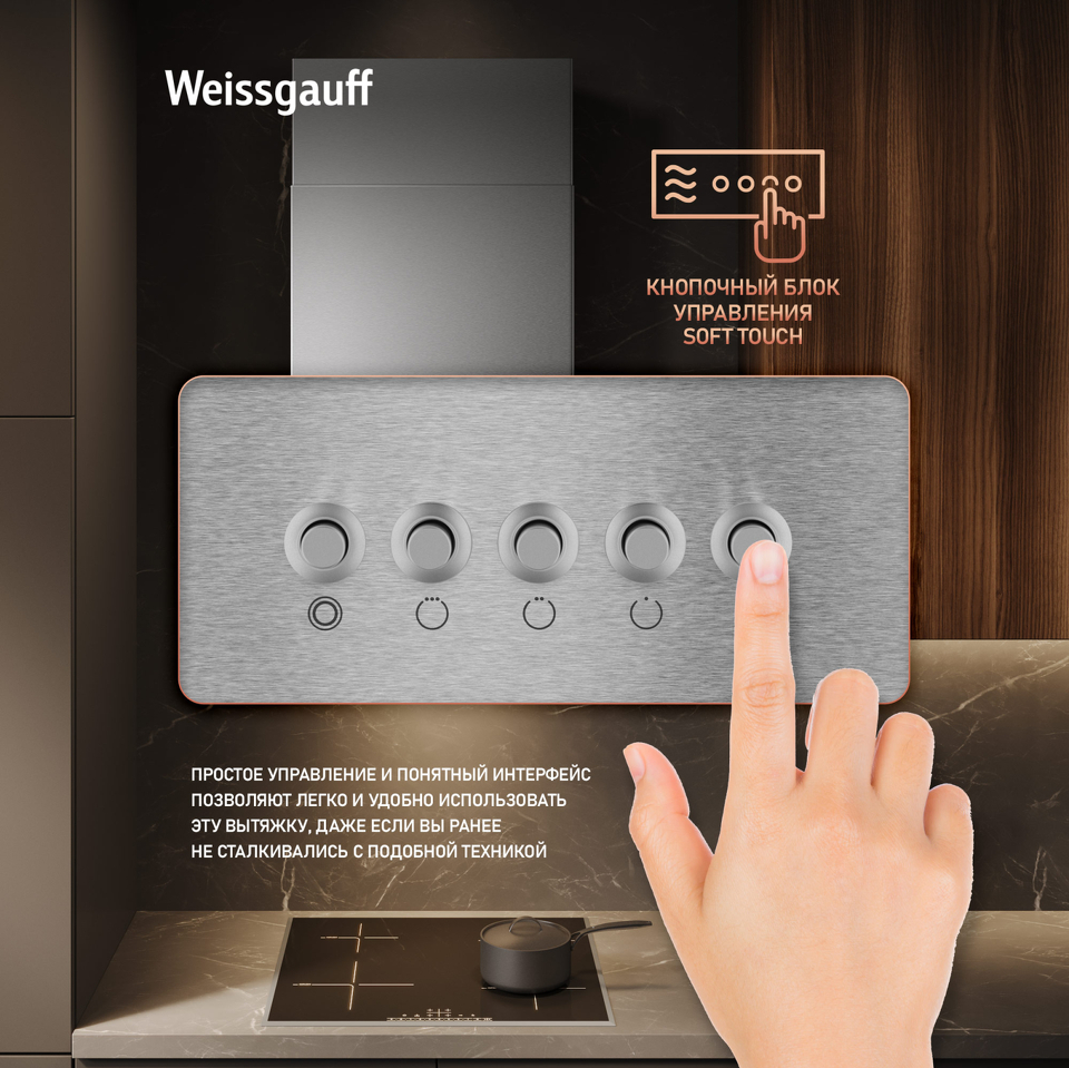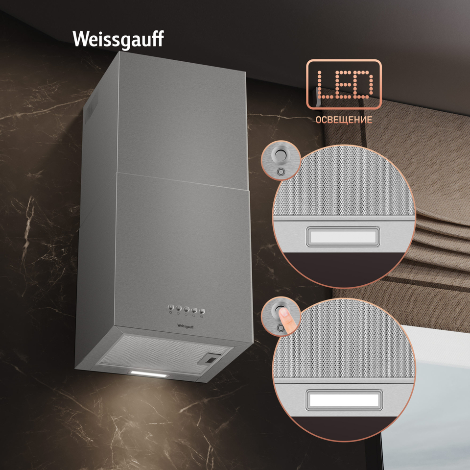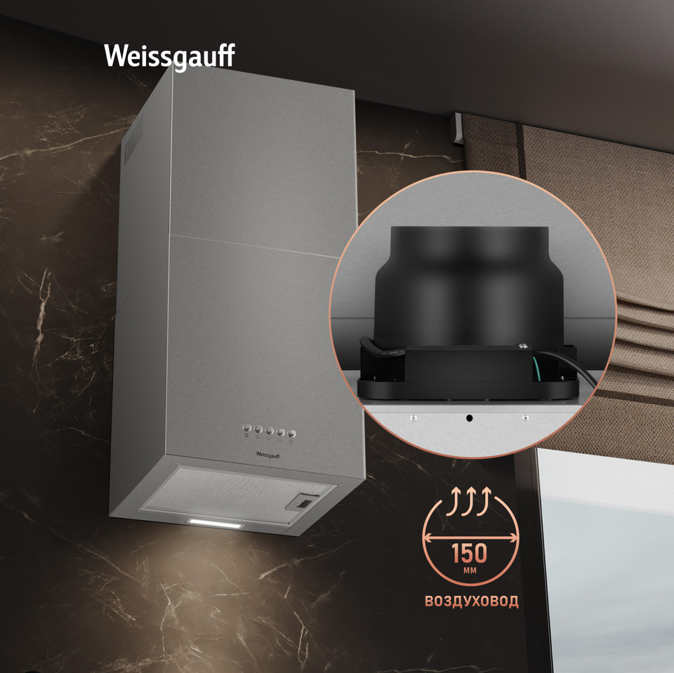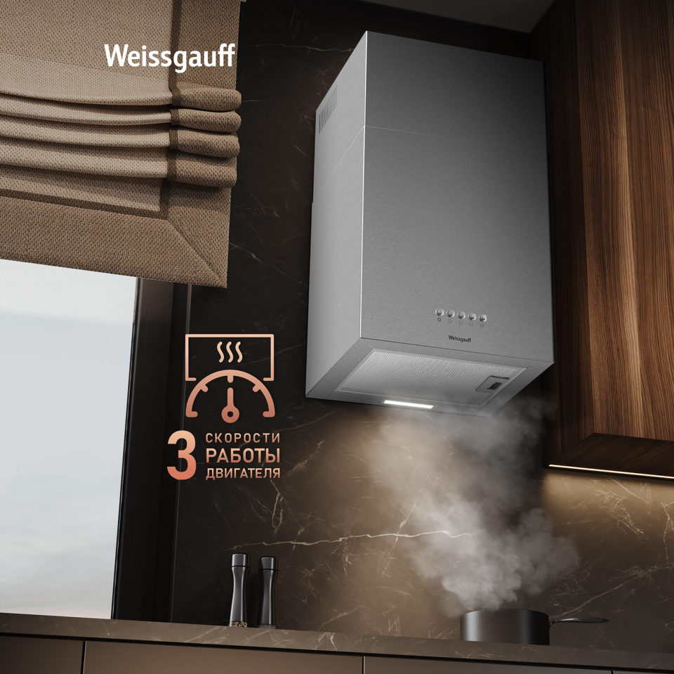 Эффективная работа в помещении площадью до 27 м2 - это гарантия того, что после установки вытяжки Weissgauff, обновление воздуха будет соответствовать всем требуемым нормам, сохраняя ваше здоровье на долгие годы!