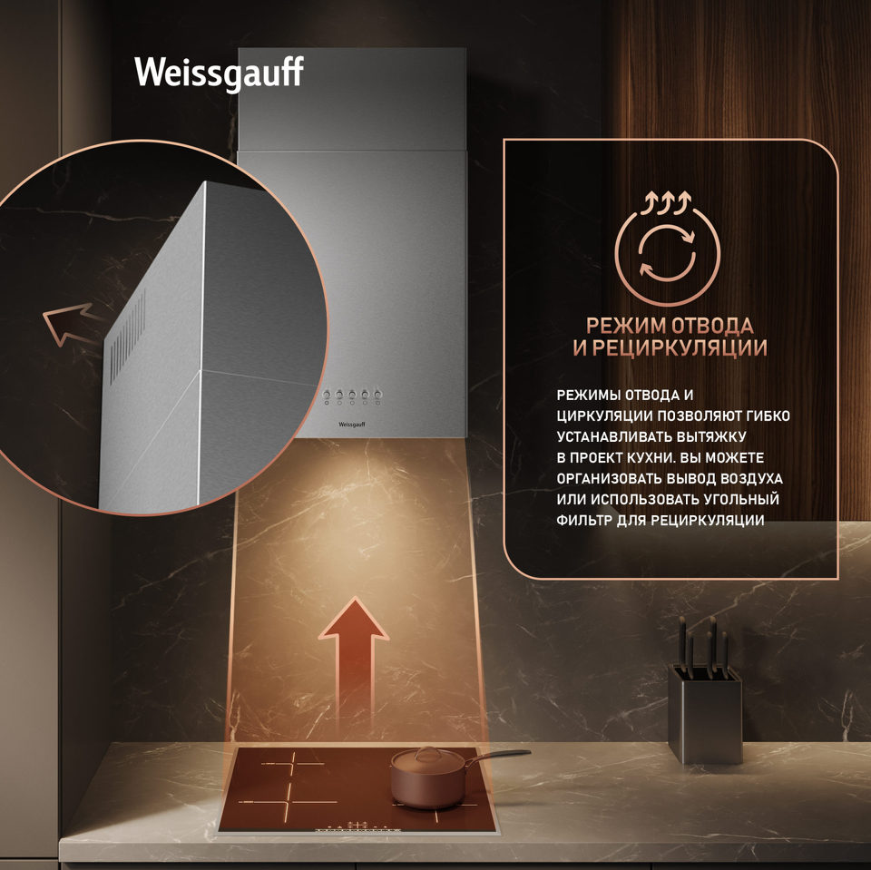 Работа в режимах отвода и циркуляции откроет вам широкие возможности по установке этой вытяжки в проект вашей кухни. Организуйте полноценный вывод воздуха из помещения или установите угольный фильтр и используйте вытяжку вместе с ним - какой бы вариант вы ни выбрали, модель от Weissgauff сделает это возможным!