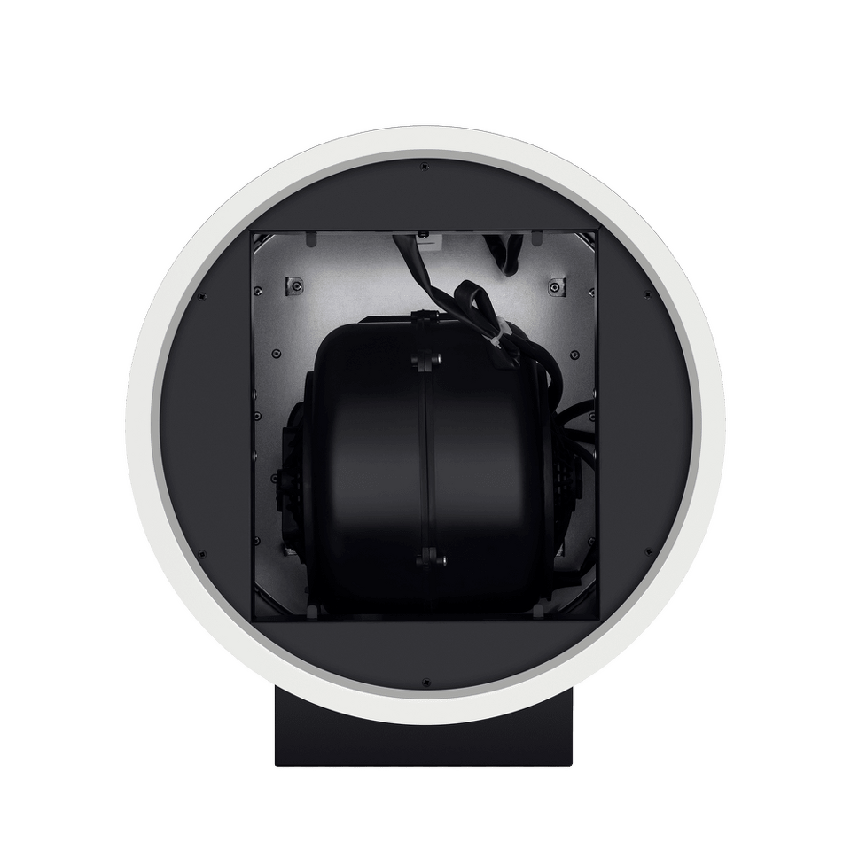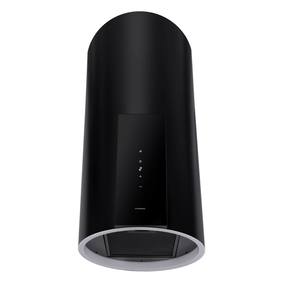 Корпус цилиндрической формы, выполненный из нержавеющей стали с термостойким покрытием, устанавливается на стену над поверхностью плиты. Алюминиевый многослойный жироулавливающий фильтр находится в нижнем торце вытяжки.