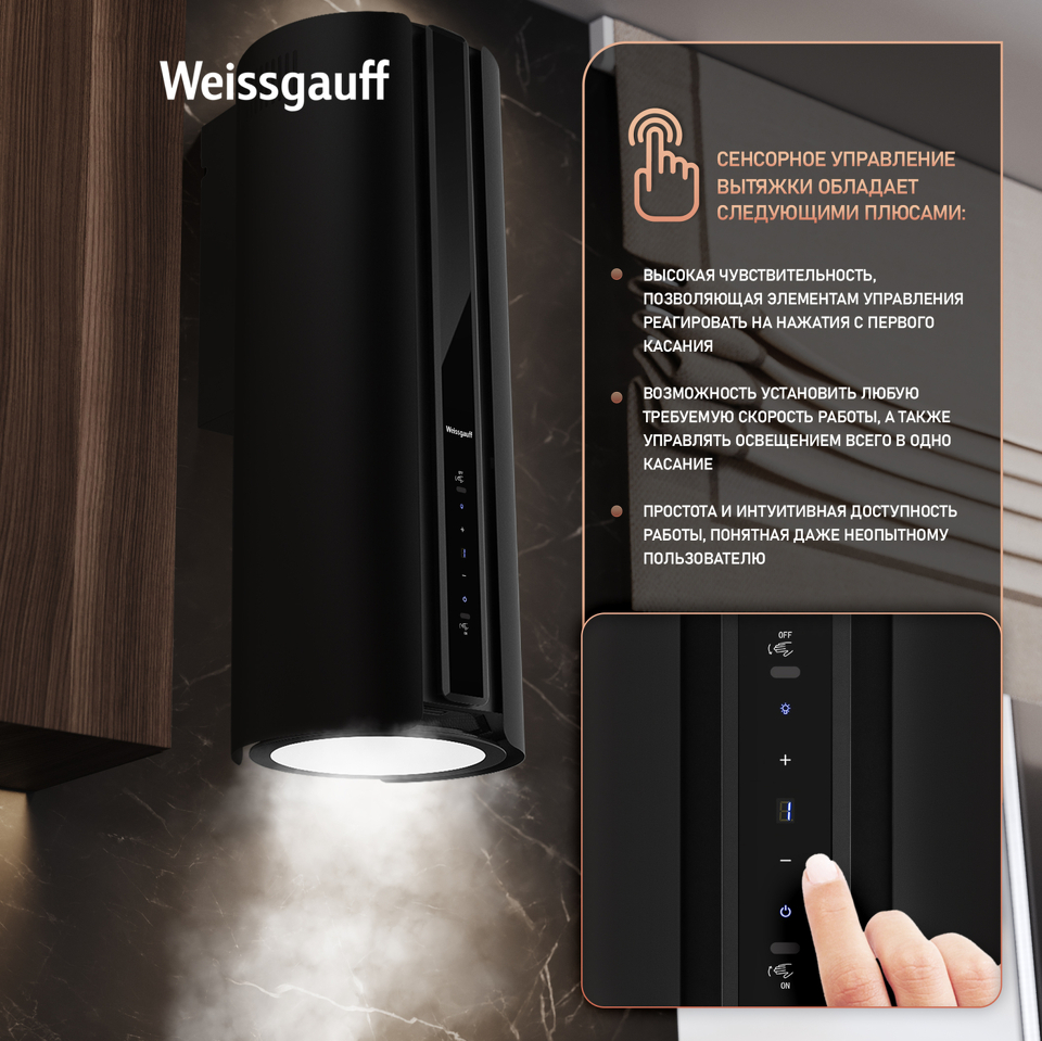 Цилиндрическая пристенная вытяжка Weissgauff, выполненная в чёрном цвете, оснащена мощным инверторным двигателем, который не только снижает уровень шума, но и повышает эффективность работы устройства. Управление осуществляется как с помощью сенсорных кнопок на корпусе, так и жестами, что значительно упрощает эксплуатацию. В дополнение к этому, мощная светодиодная лампа обеспечивает яркое освещение, делая работу на кухне более комфортной!