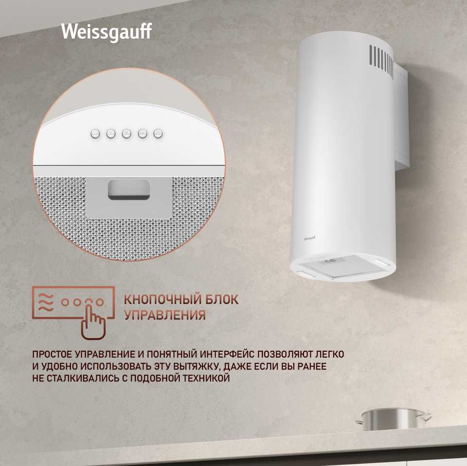 Практичная и эффективная пристенная вытяжка Weissgauff, выполненная в белом цвете, не только эффективно справляется с поддержанием циркуляции воздуха в помещении, но и отлично вписывается в дизайн любого интерьера, подчеркивая индивидуальность вашей кухни. А надежный кнопочный блок управления позволит вам буквально в одно нажатие включить вытяжку на необходимой скорости!