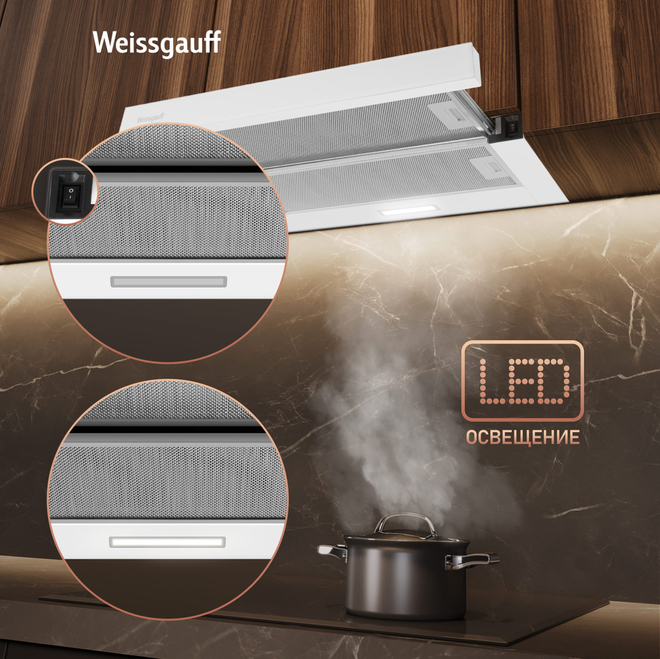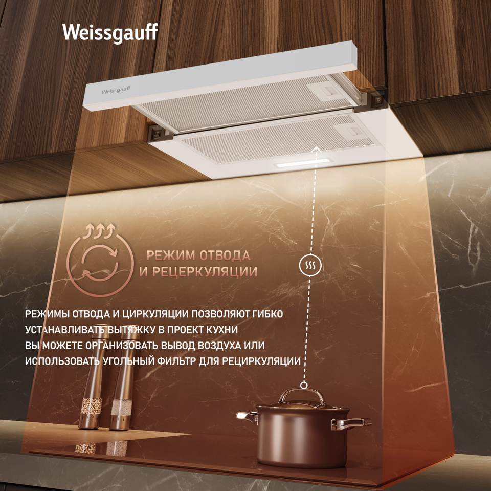 Эффективная система из двух моторов делает данное устройство самой производительной вытяжкой в линейке телескопических моделей Weissgauff!